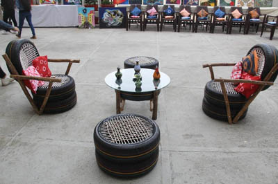 Indoor and outdoor recycling practices: Being a design institute, our students are encouraged to adopt green design thinking and use various sustainable materials like fabric, yarns, wood, canvas, earthen clay pots, iron etc. to make their products. All the faculty members guide students to use waste material or old fabrics to make new products by following recycling or upcycling. They used old denims to make bags, old muslin toils are converted into new garments by using surface exploration techniques, old tyres are converted into new furniture, and used plastic bottles are used for plantation after beautification.